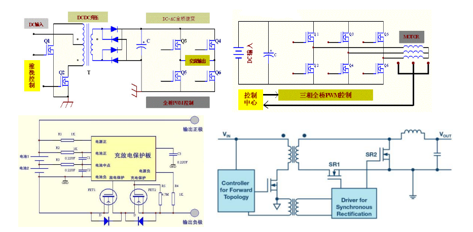 (1)儲(chǔ)能電源/太陽(yáng)能控制器/逆變器/UPS等電源的DC-DC升壓結(jié)構(gòu)使用推免結(jié)構(gòu)或者半橋、全橋結(jié)構(gòu)。