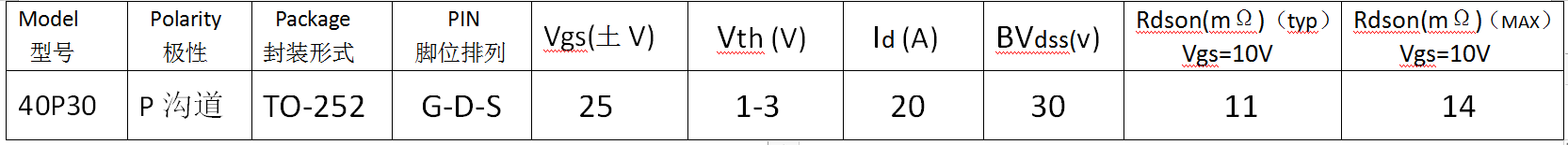 為了解決電子工程師在設(shè)計電源的時候能提高過流保護的功能,飛虹電子研發(fā)了型號為40P03的MOS管,采用P溝道溝槽工藝,封裝形式為TO-252,腳位排列是G-D-S,mos管廠家其他參數(shù)請看下圖: