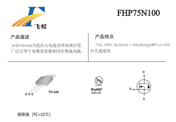 FHP75N100的主要封裝形式是TO-220,腳位排列位GDS。這款75N100場(chǎng)效應(yīng)管產(chǎn)品具體參數(shù):Vgs(±V):25;VTH(V):2-4;ID(A):75;BVdss(V):100。RDS (on) = 10mΩ(typ)@V GS =10V,開(kāi)關(guān)速度快。