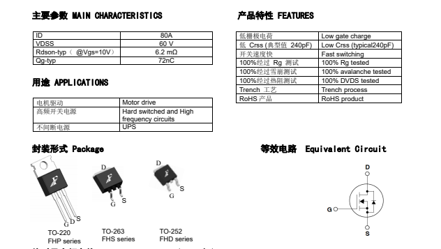 具有80A、60V的電流、電壓,RDS(on) = 6.2mΩtyp) ,最高柵源電壓@VGS =±20 V,100% EAS測試,100% Rg測試,100% DVDS熱阻測試,一致性高,高可靠性,開關速度快,低導通內(nèi)阻RDS(on),低Crss。