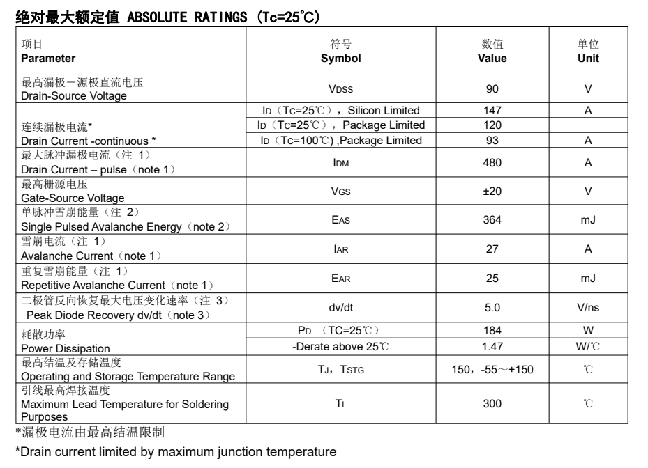 具有140A、100V的電流、電壓, RDS(on) = 6.2mΩ(max) ,最高柵源電壓@VGS =±25V,內(nèi)阻小,抗過電流能力好的特點。