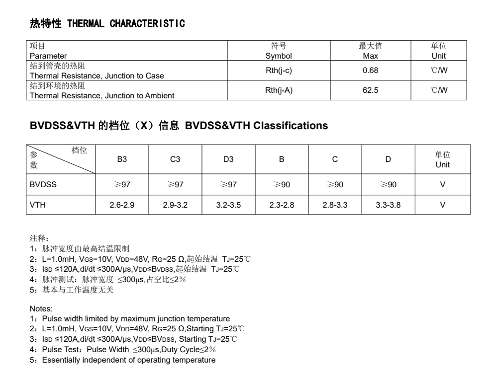其產(chǎn)品參數(shù):具有120A電流、90V電壓, RDS(on) = 5.4mΩ(max),最高柵源電壓 @VGS =±20 V,SGT 工藝、RoHS 產(chǎn)品、100%經(jīng)過熱阻測試、100%經(jīng)過雪崩測試、100%經(jīng)過 Rg 測試、開關(guān)速度快、低 Crss (典型值 pF)、低柵極電荷的特點。