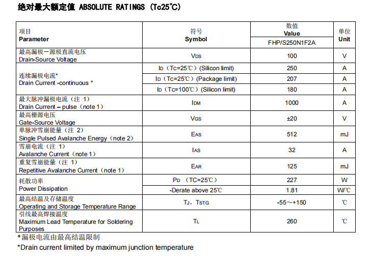 當然,MPPT控制器MOS管,FHP250N1F2A在應用中,我們逆變器研發(fā)工程師一定要了解這款優(yōu)質FHP250N1F2A國產場效應管的詳細參數:其具有250A、100V的電流、電壓, RDS(on) = 3.0mΩ(MAX) @VGS = 10 V,RDS(on) = 2.5mΩ(TYP) @VGS = 10 V,最高柵源電壓@VGS =±20 V。