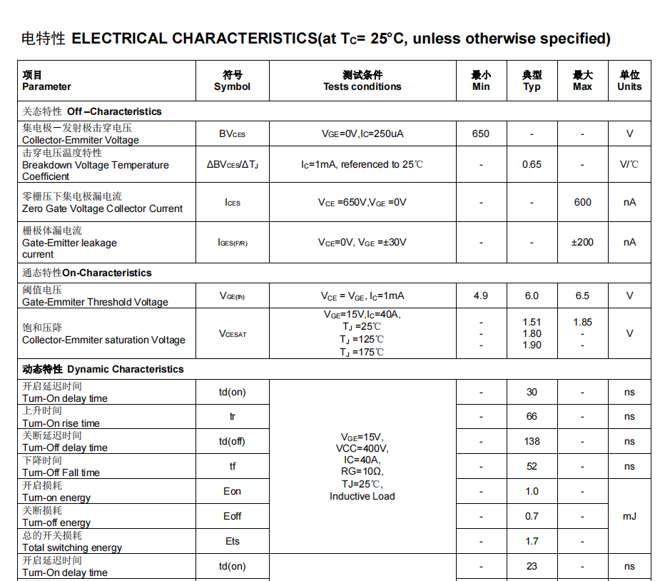 目前在應(yīng)用中,我們UPS高頻逆變電路研發(fā)工程師一定要了解優(yōu)質(zhì)FHA40T65A國產(chǎn)型號的詳細(xì)參數(shù):其具有40A, 650V, VCEsat典型值:1.51V,<1.85V;ID (Tc=100℃):40A;BVdss:650V;IF (Tc=25℃):40A;IF (Tc=100℃):20A。